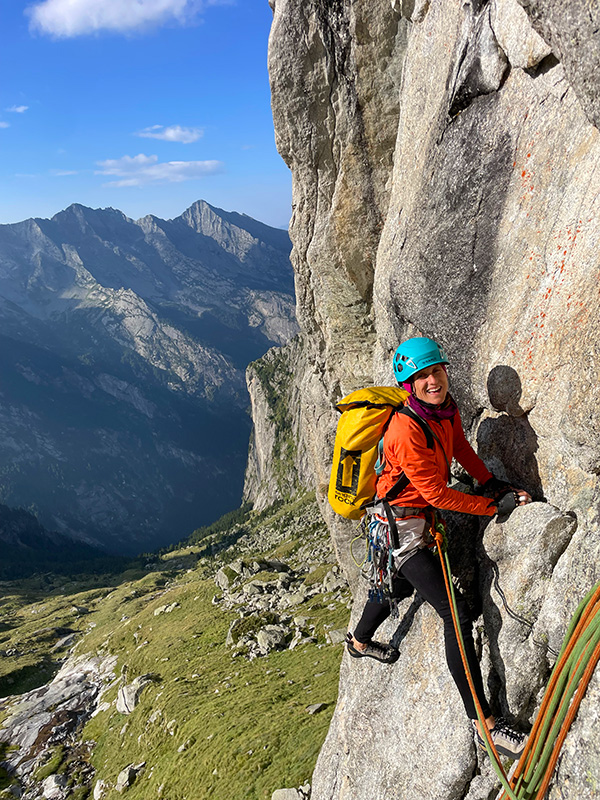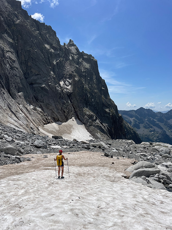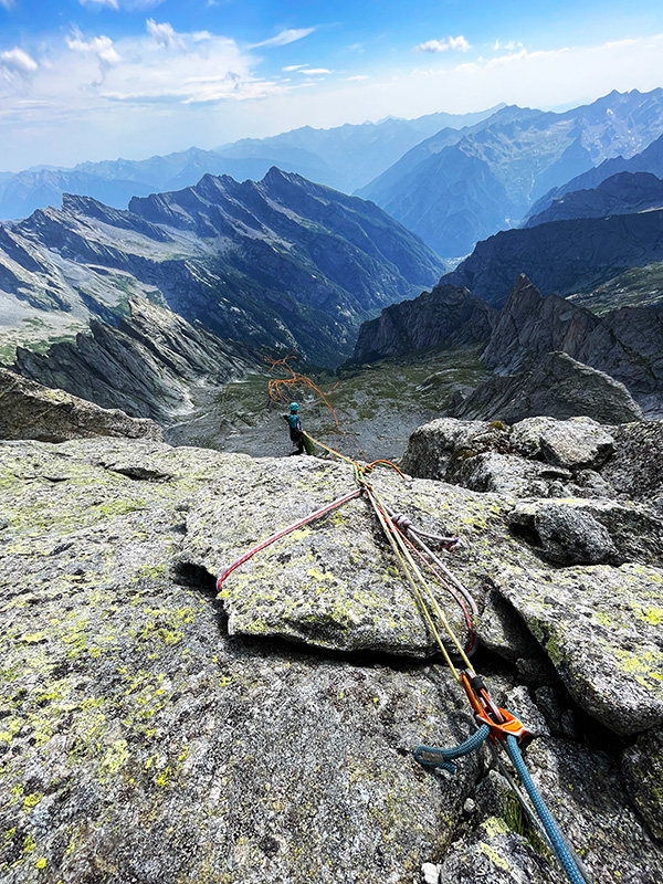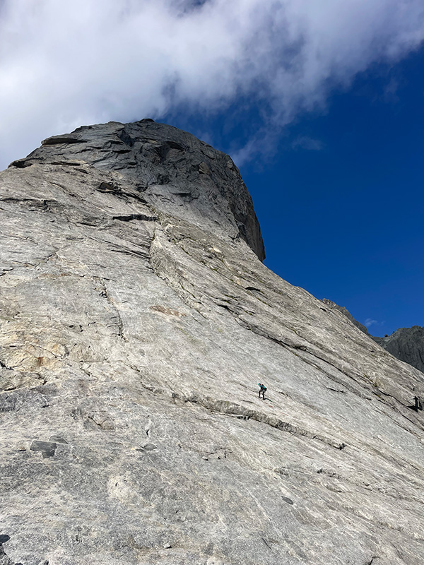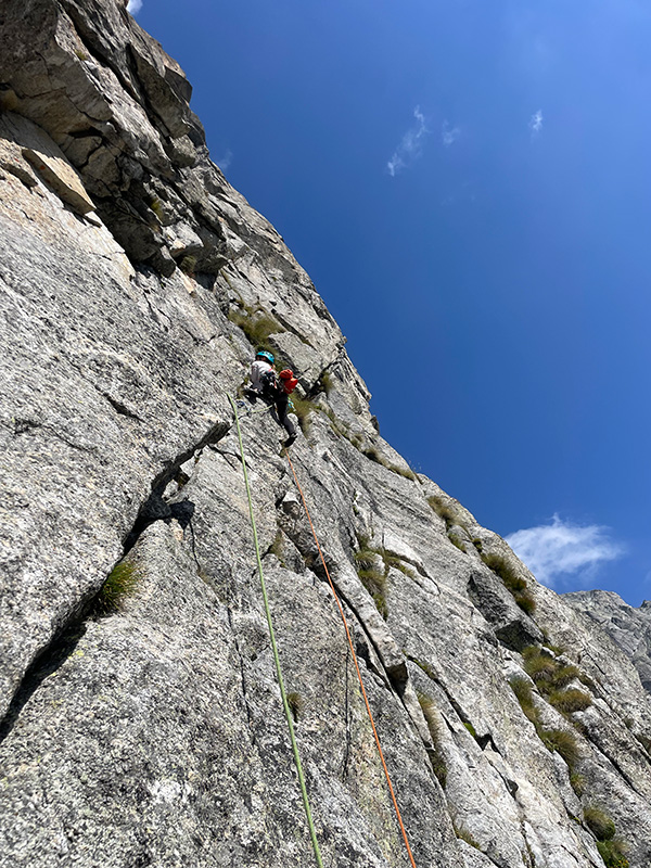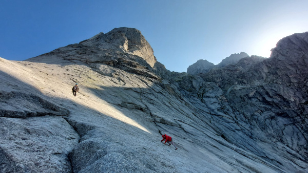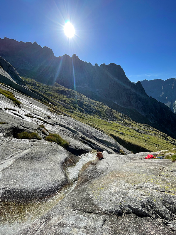 Ráno jemňounce mrholí, ale dva lezci nastupují do Taldo Nusdeo. Jediná cesta Val Torrone, ve které jsem někoho viděla. S Bobrem jsme ji lezli loni (viz článek). Tipla jsem, že přišli z refugia, a tak snad tuší předpověď na dnešní den. Za půl hodiny už prosvítá slunce a já s Andrejkou znovu zvedáme hlavy u nástupu Ferry Ultra. Tentokráte v 8:30 ráno, s mnohem větší zásobou vody a s klidem a smířením lidí, kteří vědí, co je čeká.