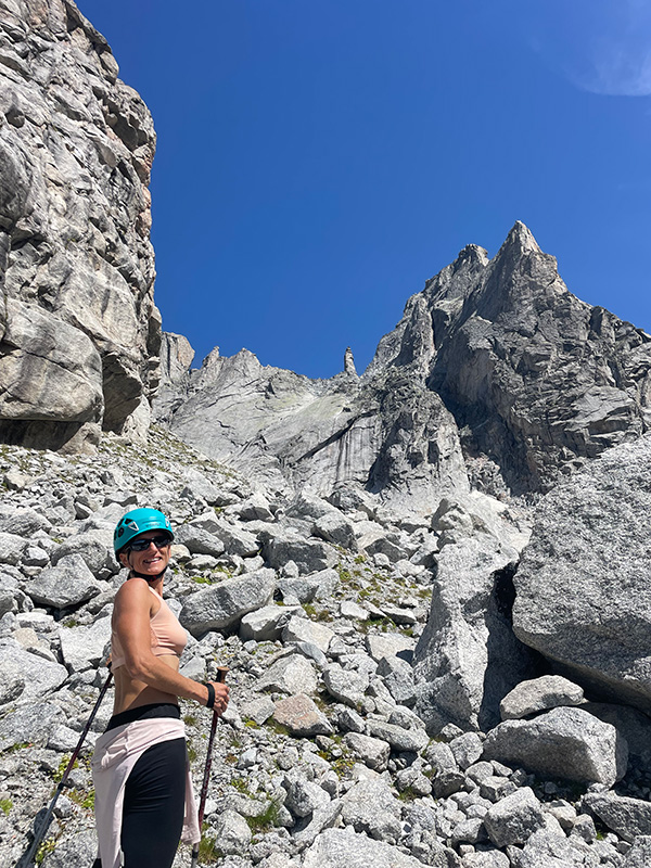 Odpočaté se vydáváme na obhlídku nástupu cesty Via Dei Cecoslovacchi na Punta Ferrario (3258m). Lezení by dnes bylo famózní, slunce hřeje do zátylku a nebe modrá a modrá, ale Felipe včera říkal, že v poledne má přijít déšť, tak se držíme při zemi. V bivaku jsem zapomněla průvodce a nechtělo se mi pro něj vracet. Takže spíše intuitivně4 se vydáváme k východní straně hory.