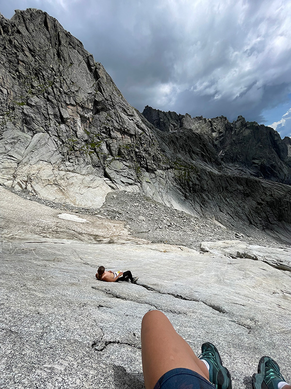 „Já myslím, že v tom průvodci to bylo vyfocený,“ zkouší Andrejka nadhodit. „Mně se tam nechce vracet. Myslím, že tam fotka nebyla, jen popis. Nějaký plotny. Zkusíme to tudy,“ odvětím jako mozek operace. A tak se ladně propleteme žlabem s menšími i většími kameny, které se nám daří neházet dolů, až staneme zase o něco výše pod východní hranou. Už během výstupu bylo čím dál jasnější, že tady nástup není. Ale byly jsme zvědavé, co se nad námi nachází. Také už minulo poledne a déšť se nekonal, takže jsme se rozhodly prostě zkoumat okolí.