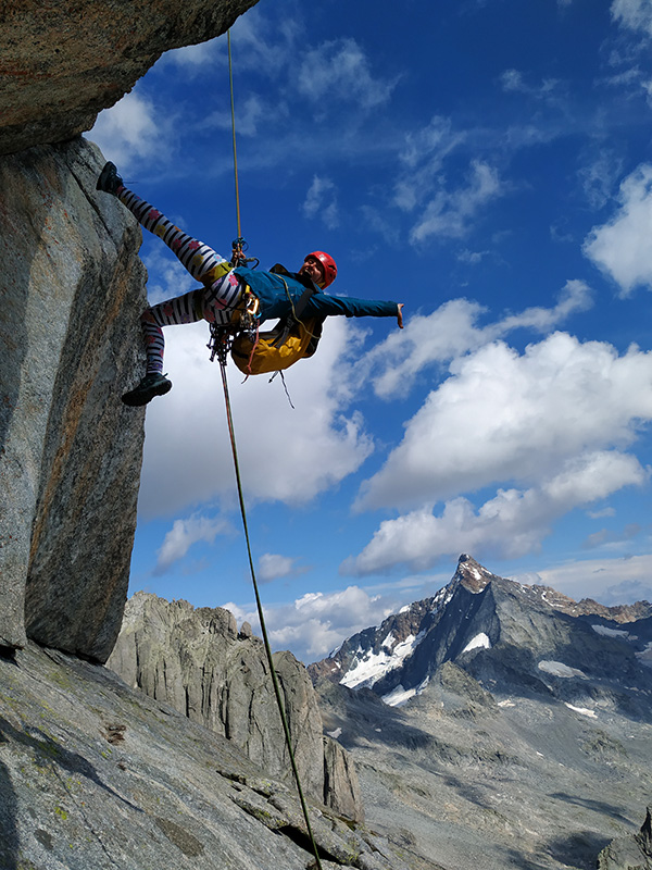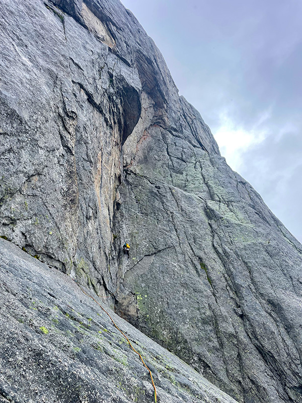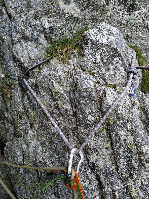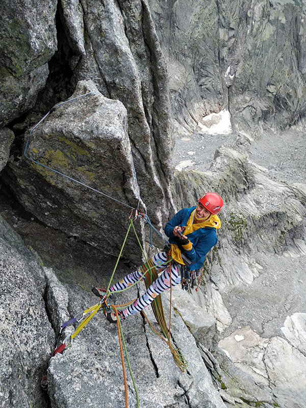 Spojuji další dvě délky a radím Andy směr dalšího lezení. Držíme linii výletu, takže já ji posílám blbě a ona bez protestů přijímá vytyčený směr. Vpravo od nás je komíno-kout, jasná slabina hory, ale to by bylo až moc jednoduchý, ne? Navíc stěna plná sokolíků, odštěpů a různých vln v plotnách nad námi vypadá lákavě. Andrejka mumlá něco o tom, že se to drolí, a že se bojí. Ale ona když se bojí, tak nejenom, že leze neustále nahoru, ale také ještě lépe jistí. Dává frendy a vklíněnce všude, kam to jde. Instinktivně leze doleva, pak zase doprava...a nebe nad námi šedne. Když vyrobí štand (= víme, že jsme blbě), začne poprchávat. Lezu za ní a všimnu si štandu ze smyček, který je napravo od nás v tom komíno-koutu. Dobrý, aspoň vím, kudy budeme slaňovat.