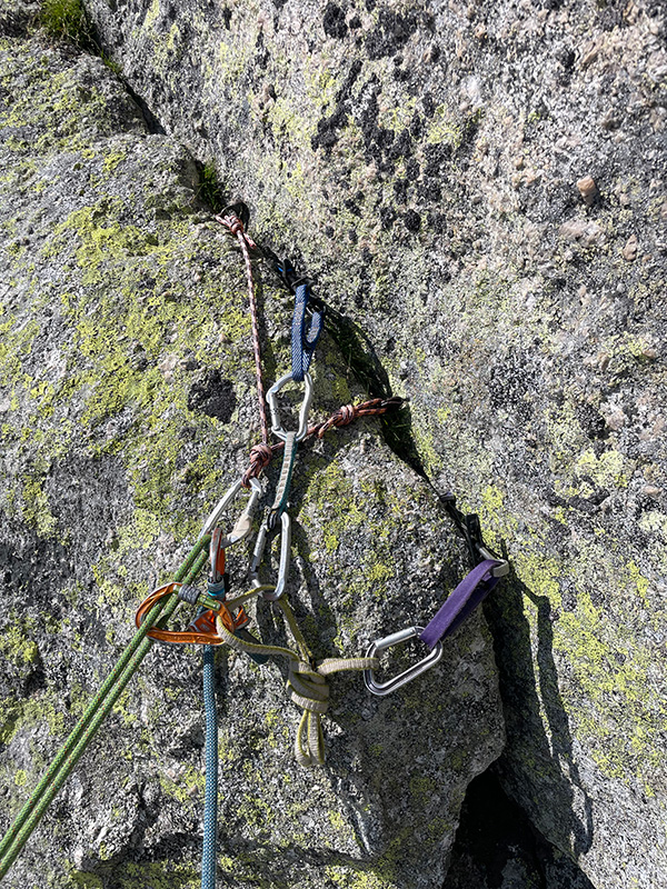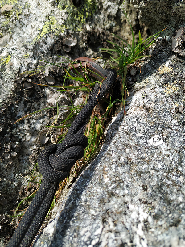 Další den (16.8.) se navazujeme pod první délkou cesty Taldo. Kamarádky Monča a Radka sem vyšly s námi s tím, že si třeba pár délek zkusí a slaní. Dle průvodce se cesta dá proslanit, ale rozhodně nečekáme žádné nýty. První tři délky, nepočítám-li první plotnovou 3a, jsou trochu rozchrust. Andrejce se nelíbí druhý štand ze dvou zrezivělých skobek, tak bez váhání leze dál. Kromě kvality materiálu tady v pětkách žádný problém není, takže se případně dají lézt souběžně. Třetí štand, kde Andrejka dobírá, je pohodlné místečko na travičce. Monča s Radkou začínají stoupat.