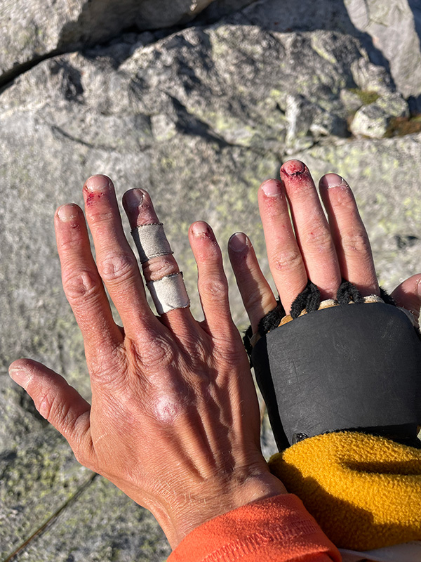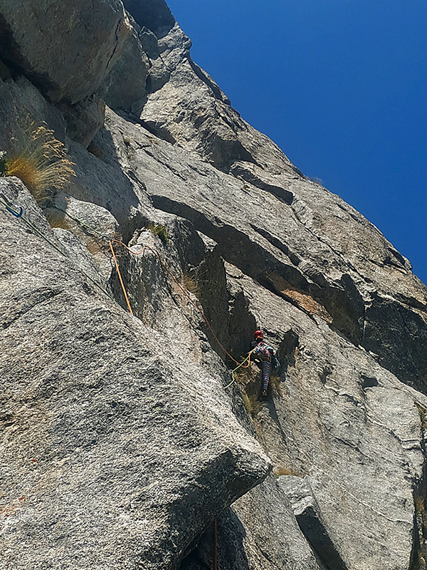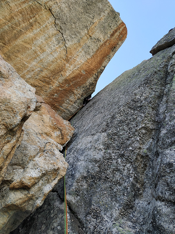To bylo za odměnu. Cítila jsem, jak je hora šťastná, že jsme neutekly. Od šesté délky to bylo žrádelní lezení - super žula, ukloněné plotny s ďolíky jak v ementálu, na některých štandech pěkné skobky s mailonou a poměrně čerstvě vyhlížejícími smyčkami. Délku 5c/A1 lezu čistě (6c) (trhlinka s asi třemi těžkými kroky) a spojuji s 5b/c, kde je fikaný nález do položeného žlábko-koutku. Zbývají 3 délky nahoru (5a, 5a, 2b), sluníčko nás hřeje, Andrejka pochopila, že tady je 5a skutečně 5a a tak radostně juchne, když jí řeknu „Lez, neštanduj, dokud ti nedojde matroš.“