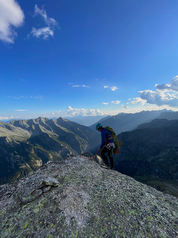 A tak ve tři odpoledne (5,5 hodiny lezení) zdravíme vrcholek Punta Ferrario, obdivujeme se jejím zubatým úbočím a vizuálně si potvrzujeme velmi špatnou přístupnost této hory ze všech stran. Nahoře radostně vískáme a prozpěvujeme - K vánocům chcem kladívko, kladívko a skobky.... a pak to tady budem hrnout ve velkým. AO2 jede!5 Prostě jsme měly hezkou vrcholovou eufórku. Slanily jsme jedna báseň a po cestě k bivaku nám bylo jasné, že zítra bude grande finále - pokus o odpytlení Ferry Ultra.