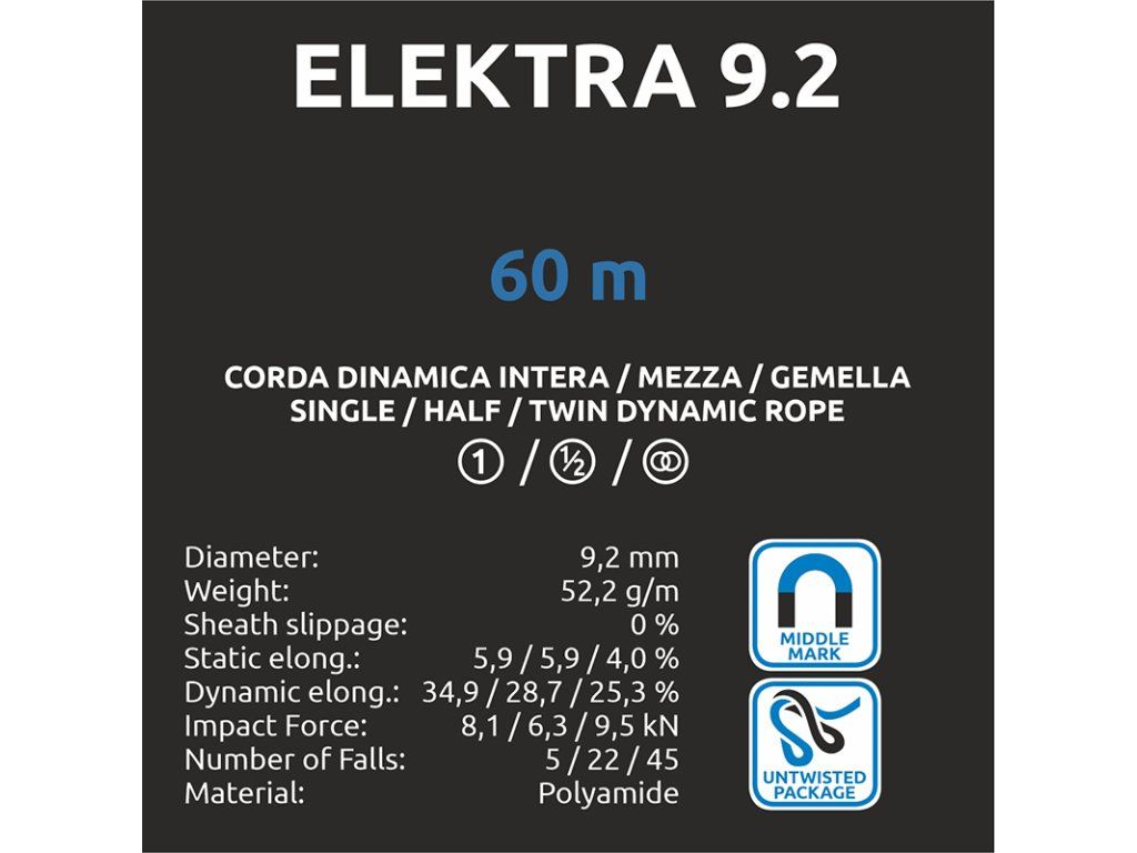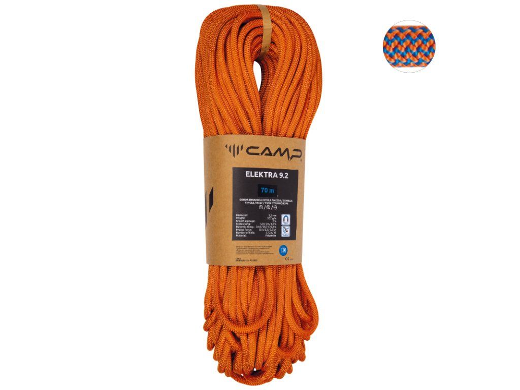 C.A.M.P. Elektra je horolezecké dynamické lano s průměrem 9,2 mm a certifikací jako jednoduché, poloviční i dvojité lano. Elektra je ideálním partnerem pro nejširší nabídku horolezeckých disciplín. Se svým průměrem 9,2 mm nabízí krom perfektního handlingu také nízkou hmotnost a dobře se ovládá jak v klasickém kyblíku ( např. C.A.M.P. PIÚ 2) tak i v poloautomatickém jistítku třeba i s anti-panic brzdou jako je C.A.M.P. Matik.
