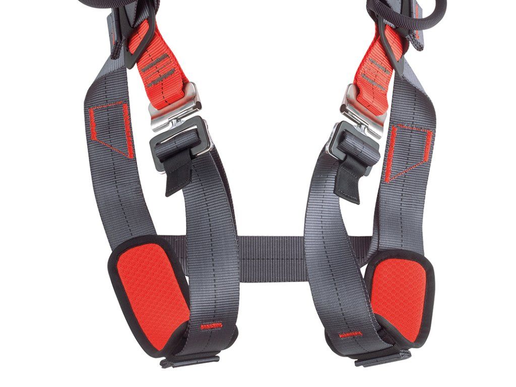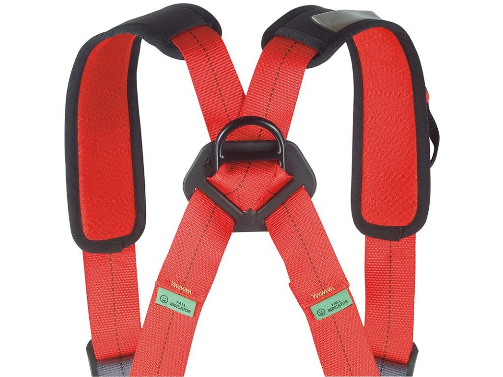 - zadní (dorzální) bod s integrovaným indikátorem zatížení pro vizuální kontrolu po zachycení pádu