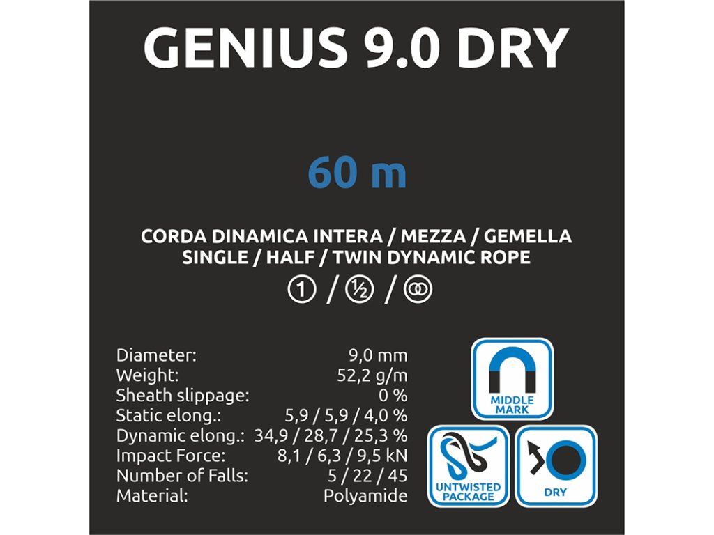 C.A.M.P. Genius je horolezecké dynamické lano s průměrem 9,0 mm, impregnací opletu a certifikací jako jednoduché, poloviční i dvojité lano. Genius je skvělým partnerem pro zkušenější vyznavače horolezeckých disciplín. Se svým průměrem 9,0 mm nabízí perfektní handling a nízkou hmotnost. Vhledem k nižšímu průměru doporučujeme jistit singl pomocí poloautomatickém jistítku třeba i s anti-panic brzdou jako je C.A.M.P. Matik.