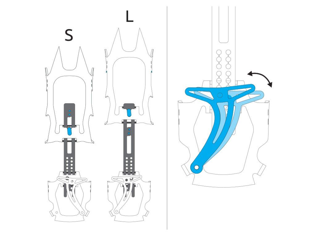 - Spojovací můstek umožňuje mikrometrické nastavení délky a lze ji nastavit do dvou poloh pro malé i velké velikosti bot bez přesahu za patu mačky