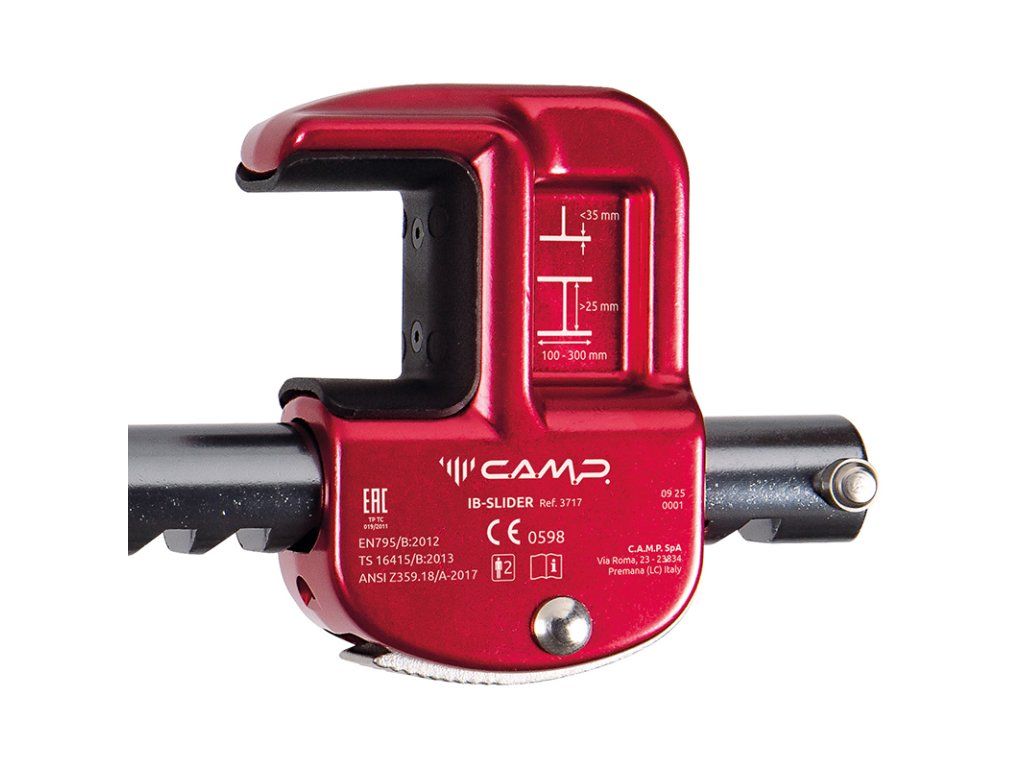 C.A.M.P. IB Slider je mobilný kotviaci záves pre oceľové I-nosníky so šírkou 100 – 310 mm. Plynulý posuv po nosníku zaisťujú ochranné polyamidové návleky na čeľustiach. Robustný oceľový kotviaci bod umožňuje rotáciu a výkyv v dvoch osiach. Nosné hliníkové bočnice sú spojené oceľovým hriadeľom s výbrusmi pre jednoduché a intuitívne nastavenie šírky pomocou dvojitého tlačidla na bočniciach.