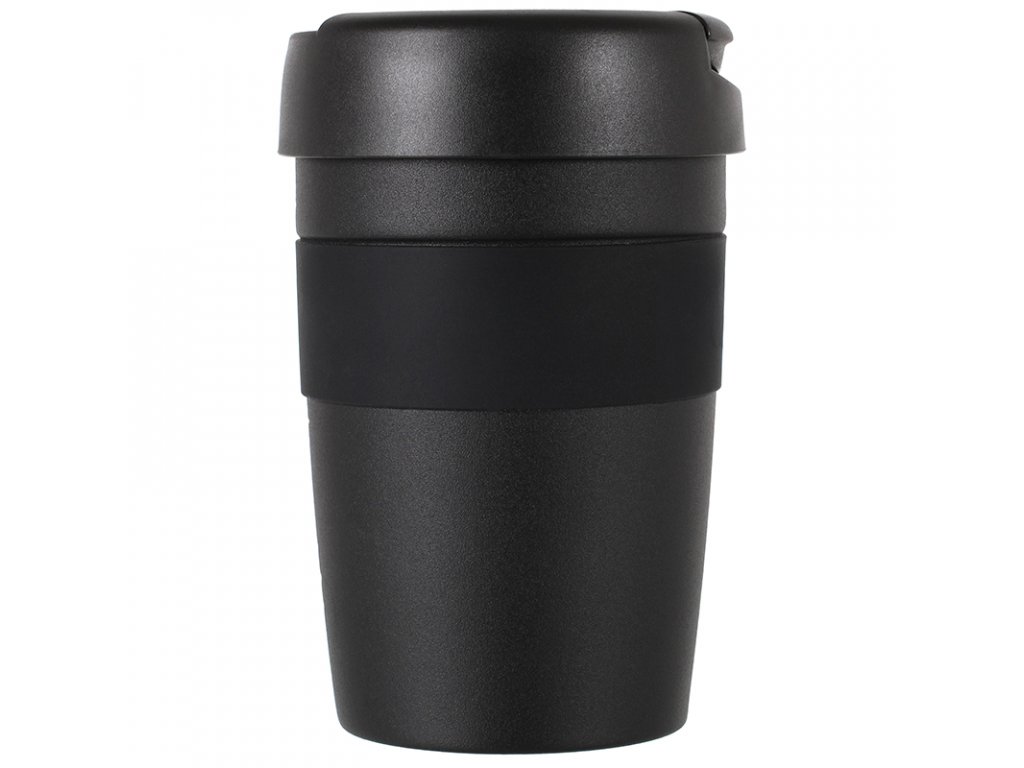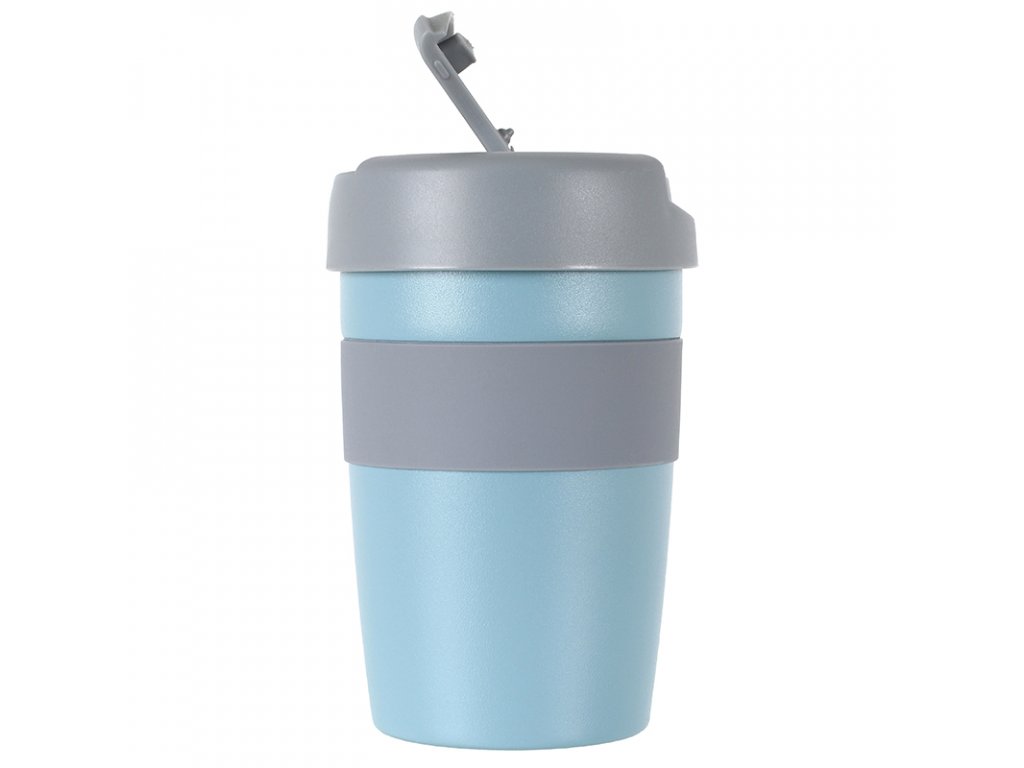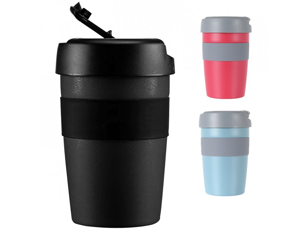 Komfortný hrnček na kávu s odklápacím náustkom a silikónovou páskou po obvode pre ľahké držanie.
